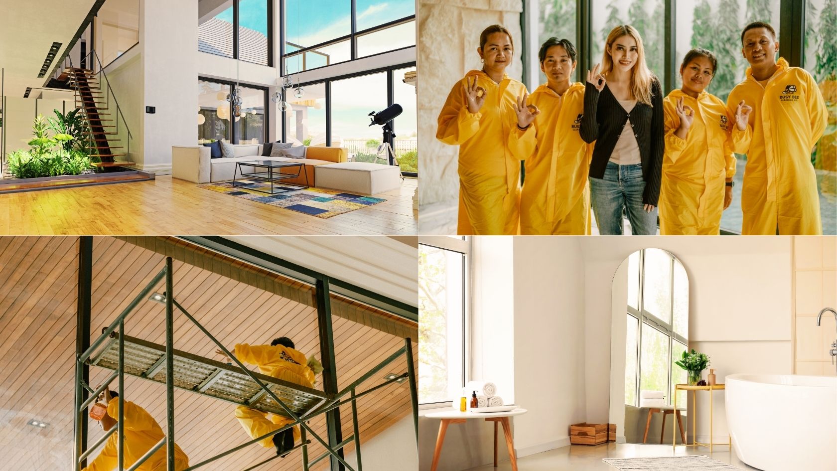 Next, let’s talk about those hard-to-reach places. Busy Bee’s team comes prepared with scaffolds that can easily reach heights between 22-30 feet. Whether it’s dusting off the highest corners of your ceilings, wiping down large windows, or ensuring those stunning light fixtures are sparkling clean, we can handle them all.